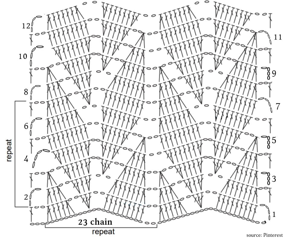 Repeat the pattern from row 2 until you reach the desired length. Make an edge working 2 rounds of sc.