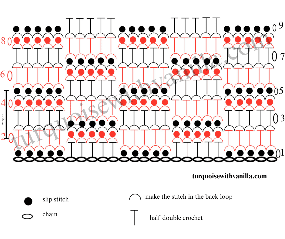 5. Row 5: ch 1, *Make 1 sl. st in every next 5 sts in the back loop, and 1 hdc in every next 5 sts in the back loop*. Repeat *-* to the last 5 sts and make 1 sl. st in the back loop in every sts to the end of the row. You should have 75 sts.