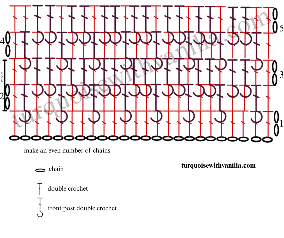 3. Row 3: chain 2 (don’t count as a stitch), dc in the same stitch, * 1 double crochet in the next stitch, 1 front post double crochet in every next 2 stitches*. Repeat *-* to the last stitch and make 1 double crochet. You should have 70 stitches.