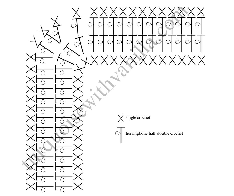 2. Round 2: ch 2, crochet herringbone half double crochet in every next stitch of the round. For the corners, crochet 2 herringbones half double crochet in each of the next 2 stitches of the corners. Slip stitch in the first stitch to close the round.